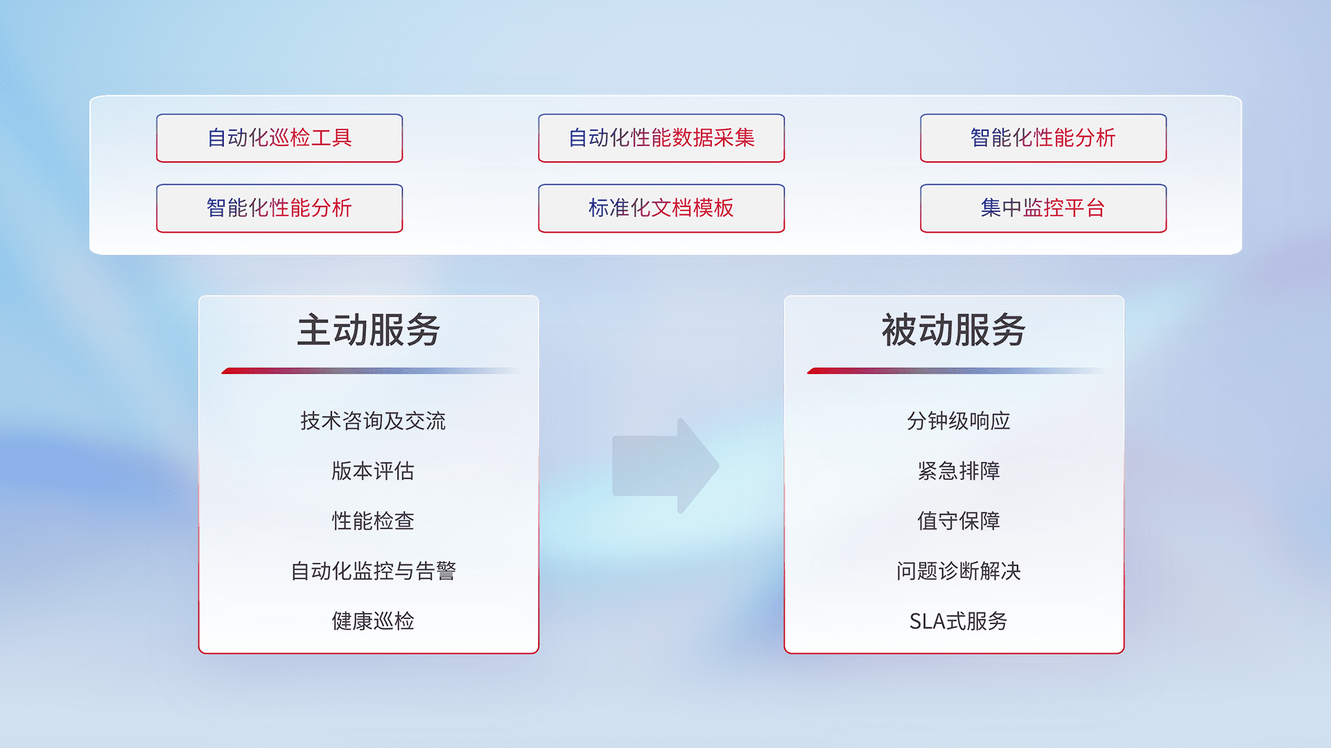 智能化工具和标准化文档,,保障服务质量,,提供主动服务(包含技术咨询、、、版本评估、、、性能检查、、、自动化监控与告警、、、、健康巡检)和被动服务包含(分钟级响应、、、紧急排障、、值守保障、、问题诊断解决、、、SLA服务)。。